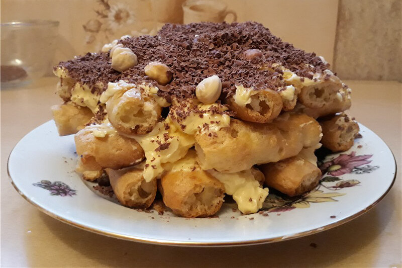 Рецепту праздничного торта «Поленница» уже много лет. Я немножко изменила основу, нашла в польском журнале рецепт булочек из заварного теста «Птыси» и использовала для выпечки торта. Тесто приготовлено на рисовой муке, можете вполне заменить её пшеничной. Поскольку заварное тесто совсем не сладкое, количество крема можно увеличить.