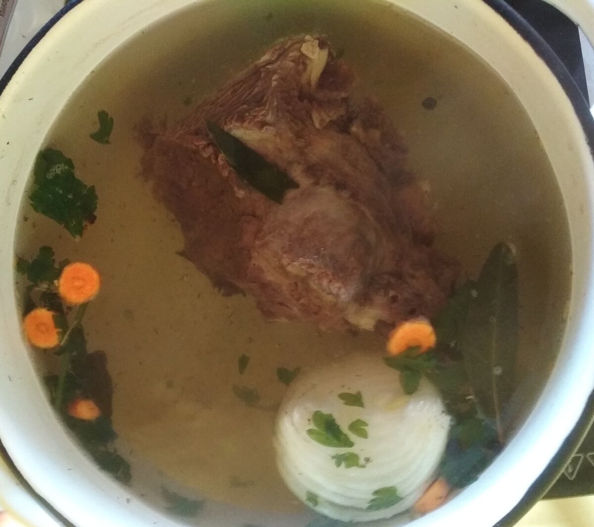 Была готова снимать пену, но это не понадобилось. Добавила соль, лук, морковь, лавровый лист, перец горошек, замороженную и сушёную зелень.