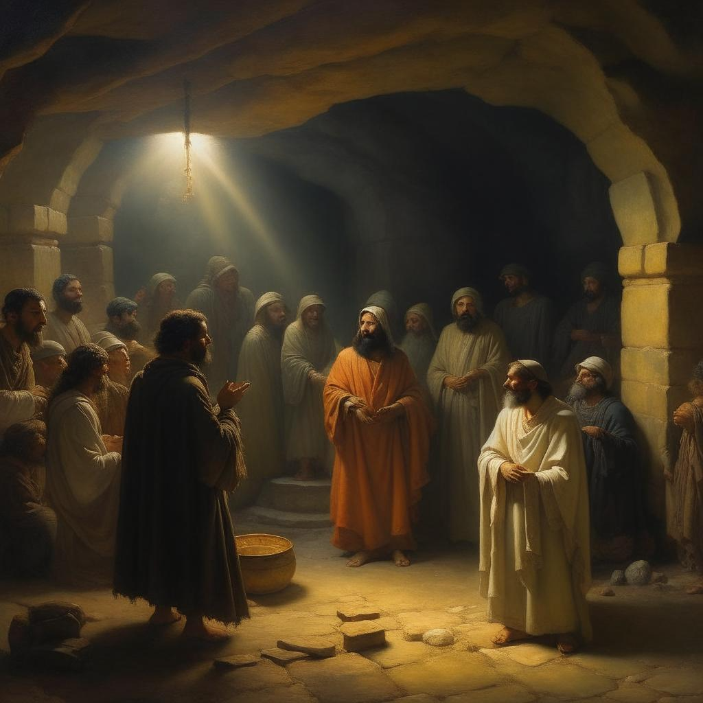 Скрываются первые христиане от гонений. Собрание христиан. Первый говорит Матвей:"Филип не ходит на утренние ни на вечерние" "Ещё на литургии не был" добавил Марк. "На крест еретика! Распять его!" кричали христиане. "Постойте!"выкрикнул Марк, так ежели мы убьем Филипа, мы помрем с голоду, кто нам будет приносить пропитание?" Так и вы приносите в церковь от трудов своих, чтобы помолились за вас.