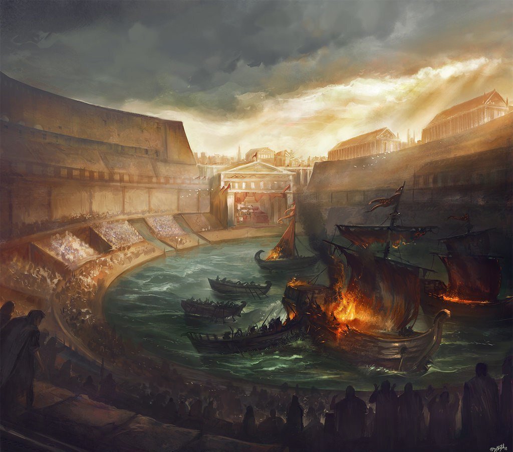 1. Навмахия — морской бой с участием настоящих кораблей. Римляне строили для этого специальные амфитеатры с водой, в которых сражались корабли. Итогом такой игры становилось множество погибших людей.