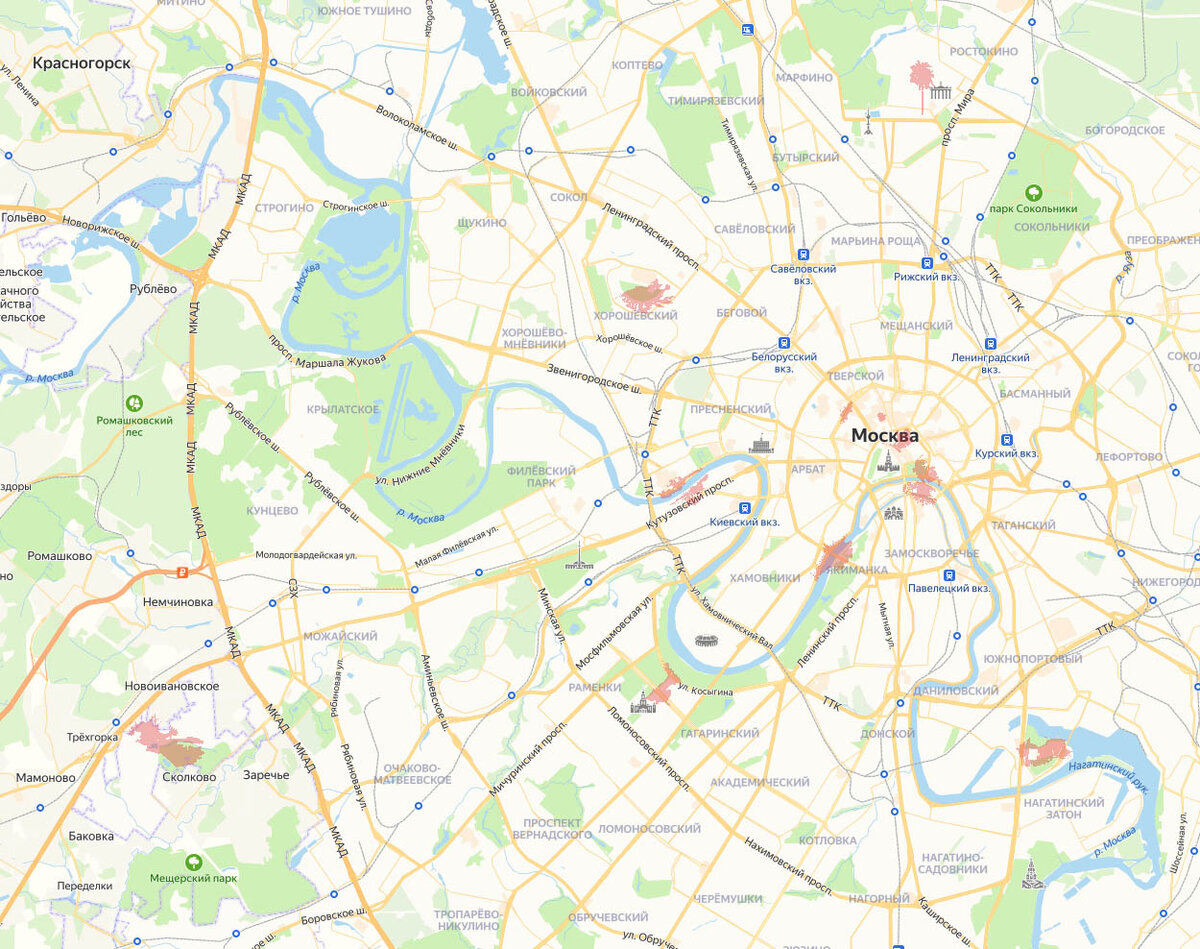 Компания МТС запустила в Москве тестовую пользовательскую 5G-сеть. Работает она в четырнадцати местах, обозначенных красным на карте: