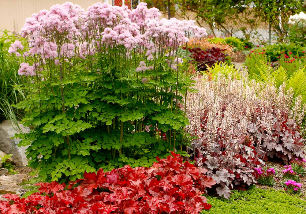 Василистник, многолетнее корневищное растение с прямостоячим стеблем, многочисленные мелкие цветки собраны в метельчатые, кистевидные или щитковидные соцветия. Окраска цветков может быть жёлтая, белая, лиловая или бледно розовая. Василистник прекрасно смотрится возле кустарников, около водоёмов, также можно высаживать на клумбах, бордюрах. Прекрасно растёт и цветёт на открытых участках, в полутени. Неприхотливое растение, на одном месте без пересадки может расти более 10 лет. Устойчив к заморозкам и не требует укрытия в зимнее время. Хорошо размножается семенами, только сеянцы зацветут на второй год. А посмотрите как красиво он смотрится в сочетании с другими яркими растениями!