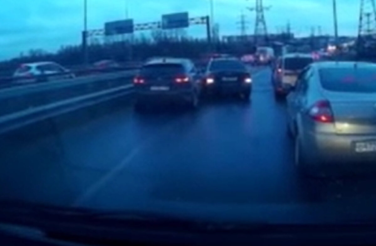 Итак, съезд с крупной автомагистрали - стоит пробка, для движения по съезду предусмотрен один ряд, но как это часто бывает - самые умные образуют ещё и второй, потом мешая тем, кто стоит честно.
