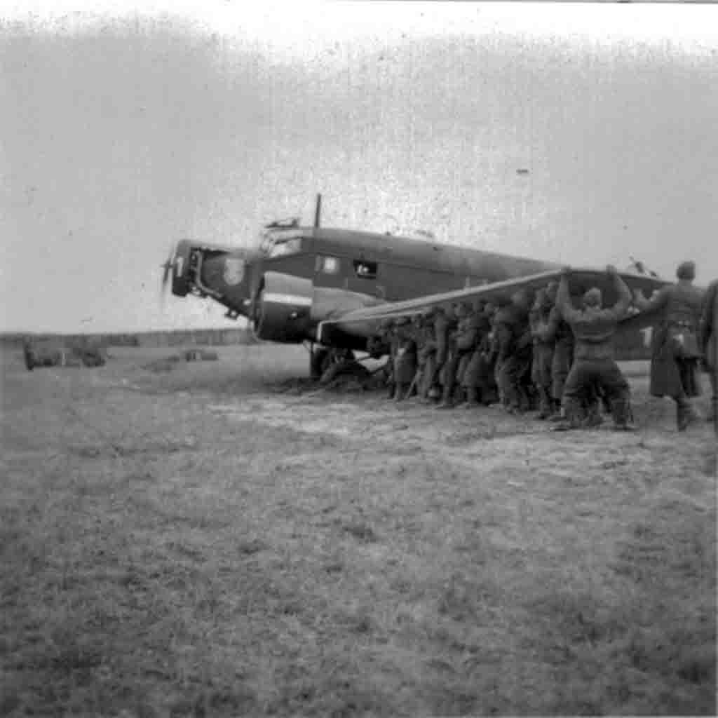 German soldiers are trying to push Junkers Ju-52 transport aircraft, which was stuck in the mud on the airfield.