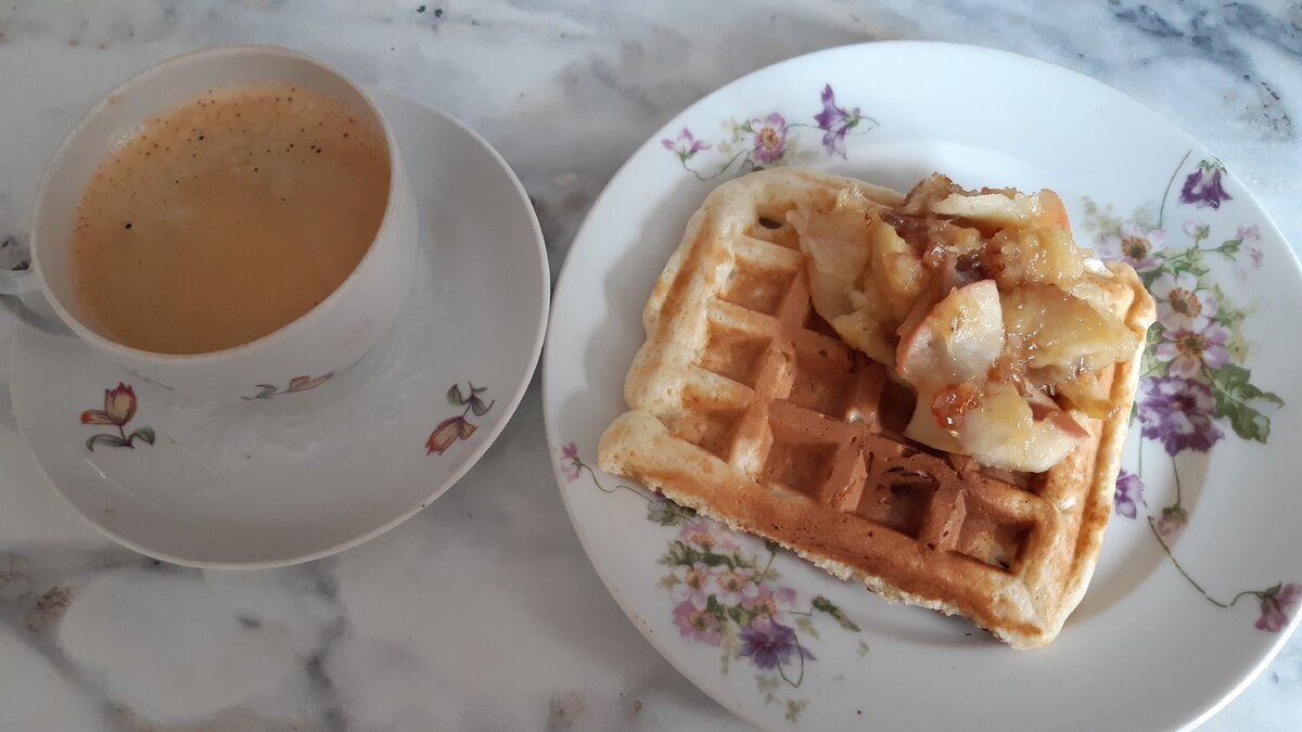 Я к этим вафлям сделала еще соус из яблока и банана с карамелью.
