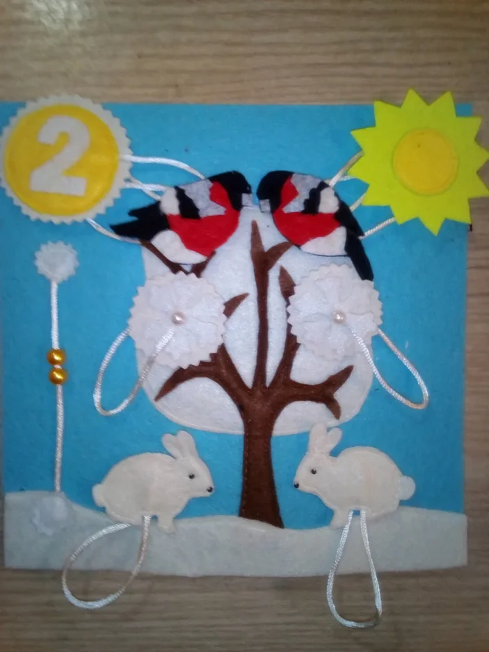 - Цифра 2 будет на липучке, зайчики, снежинки, снегири тоже на липучке, солнышко на кнопочке.