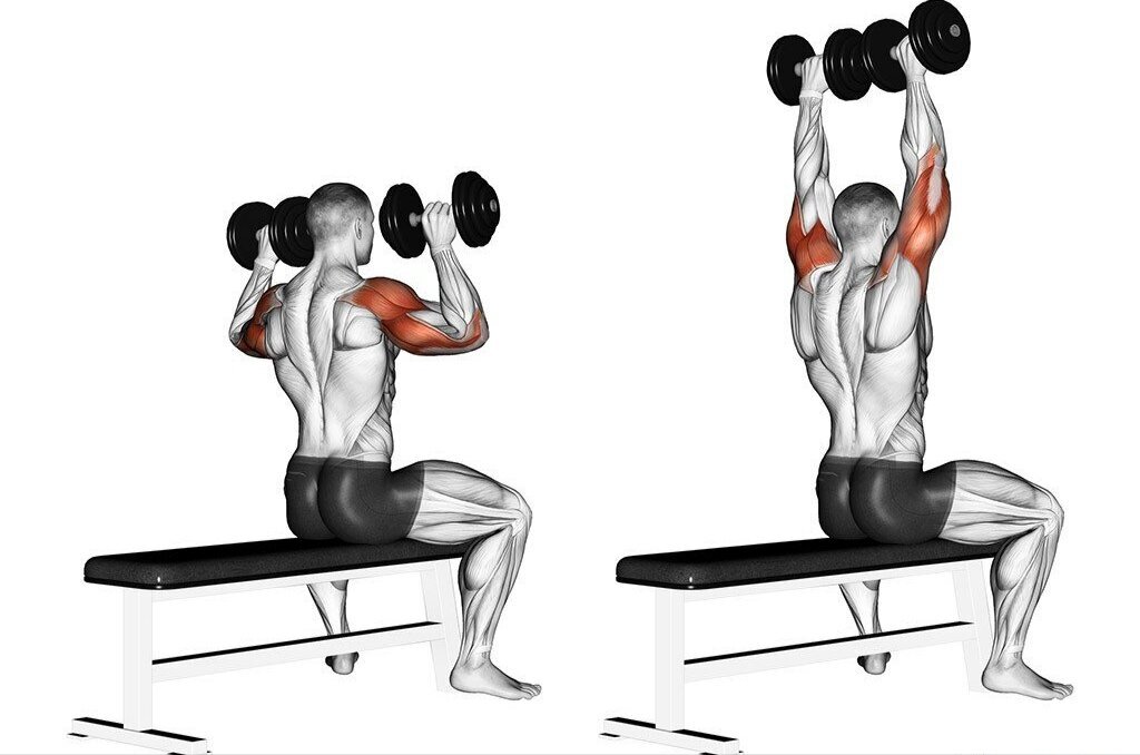 Плечи (развод гантелей в стороны, поднятие гантелей из положения сидя или поднимаю гриф)