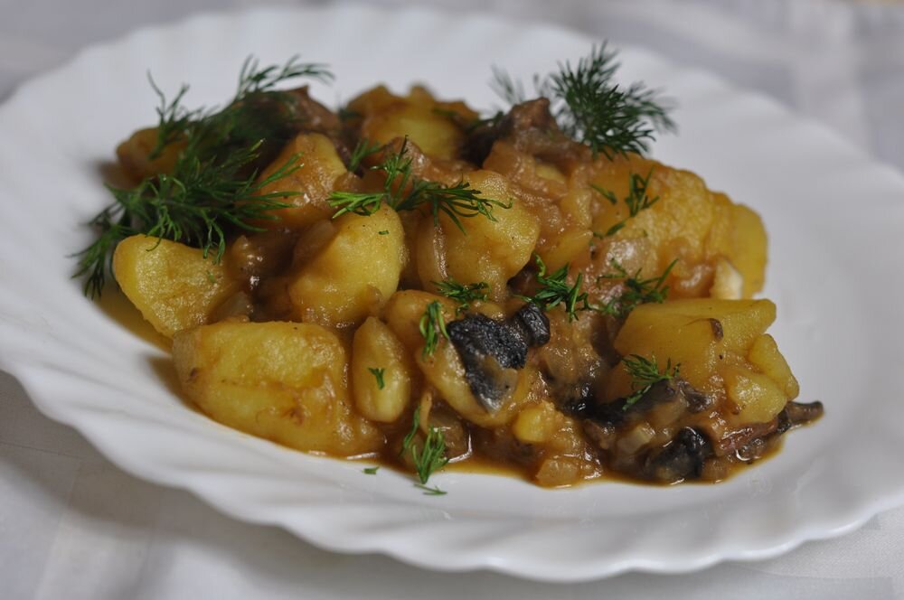 - Картофель нарежьте ломтиками, обжарьте, соедините с пассерованным луком, грибами и тушите до готовности.При подаче посыпьте рубленой зеленью