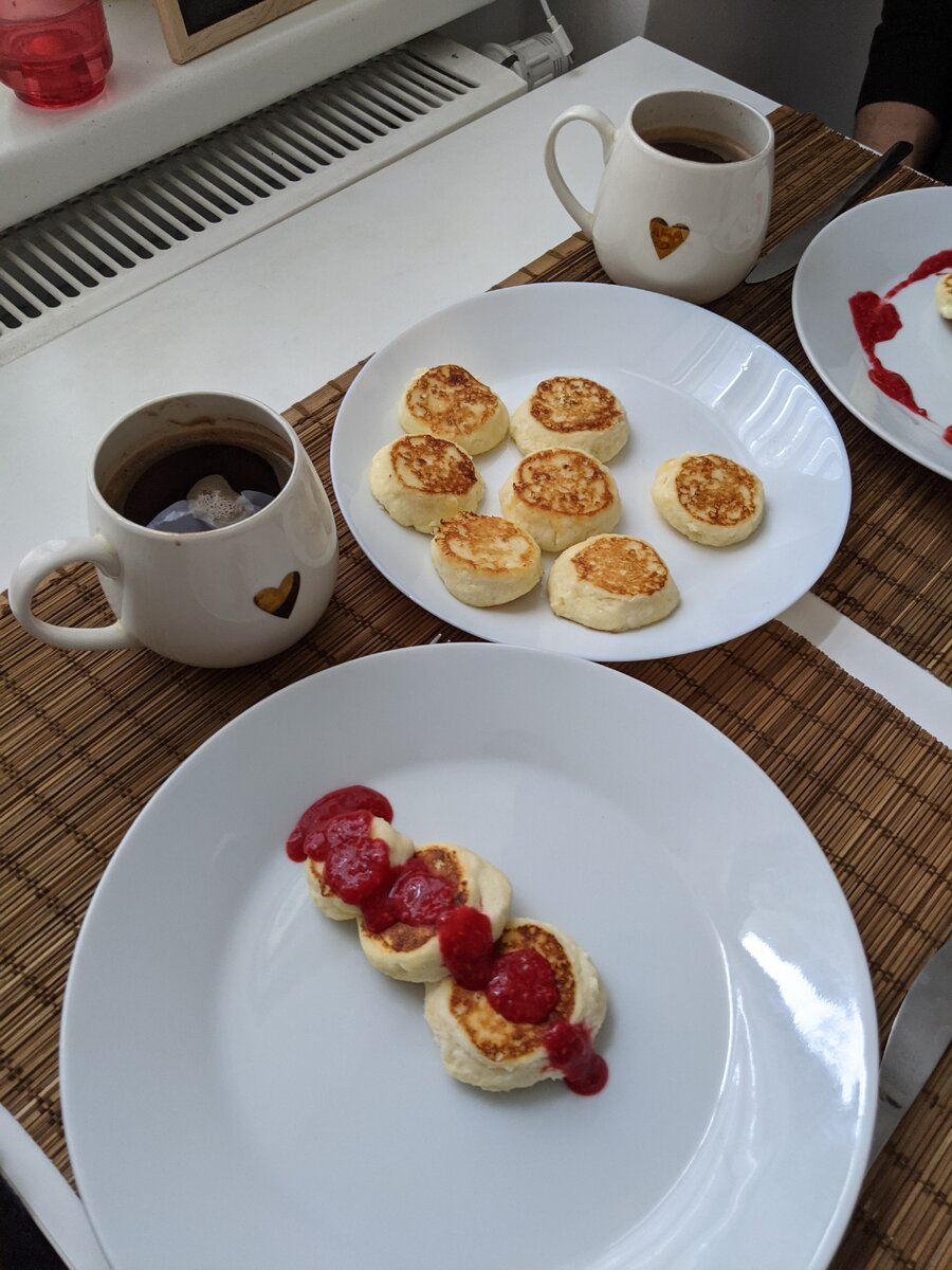 Подаём с любимыми топпингами! Мы любим со сметаной и вареньем!