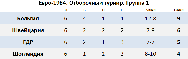 Уже начиная с первой группы, результаты были неожиданными. Сборная Швейцарии считавшейся аутсайдером, неожиданно для всех поборолась за выход на турнир и заняла второе место в группе. Победителем группы стала сборная Бельгии, финалист ЧЕ-1980. Неожиданно сборная Шотландии, которую считали главным конкурентом, заняла последнее место.