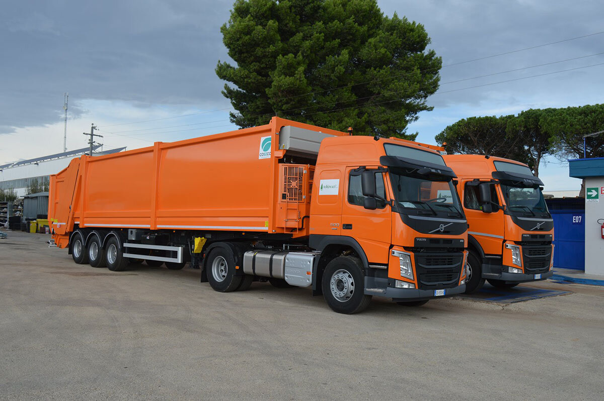 Коммунальный грузовик, занимающийся вывозом мусора, в просторечии называется мусоровозом. И все знают, что такие транспортные средства создаются путем монтажа специальной кузовной на одиночное автомобильное шасси с разной грузоподъемностью. Но вот полуприцеп-мусоровоз, такое встречается не часто. В конце прошлого года в автопарк компании Tekneko (центральная Италия) поступили в эксплуатацию несколько 44-тонных автопоездов. Каждый из них имел в своем составе седельный тягач Volv o F M 500 (4х2) Globetrotter и трехосный герметичный полуприцеп Caseco K6 с внутренним объемом 50 м3 . Основная цель каждой сцепки состояла в том, чтобы загружать твердые бытовые отходы из бункеров небольших транспортных средств, а затем вывезти весь мусор на полигоны для захоронения или на заводы по переработке. То есть маленький или средненький мусоровоз подъезжает к кормовой части трейлера, и выгружает содержимое в приемное отделение полуприцепа. После этого гидроприводной борт заталкивает полученный мусор