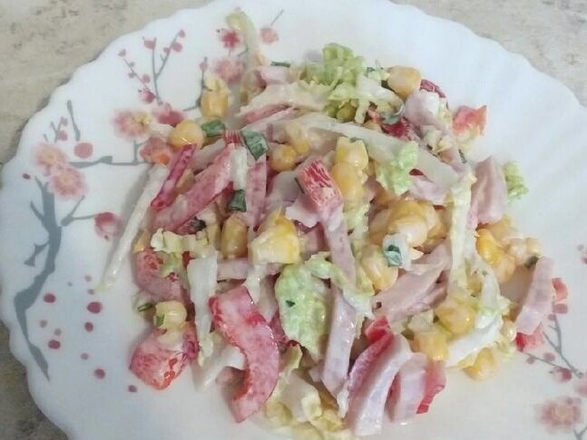 5. Смешать в салатнике ветчину, перец, пекинскую капусту и кукурузу.