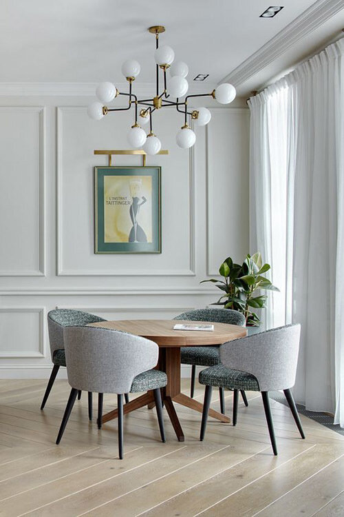 Чтобы интерьер не получился серым и безликим, нужно разбавить сдержанность в оттенках и умеренность в формах. В частности, можно применить декоративные элементы классического дизайна (картины, статуэтки, зеркала). Однако избыток деталей испортит интерьер, поэтому важно не переборщить с атрибутами роскошной жизни.