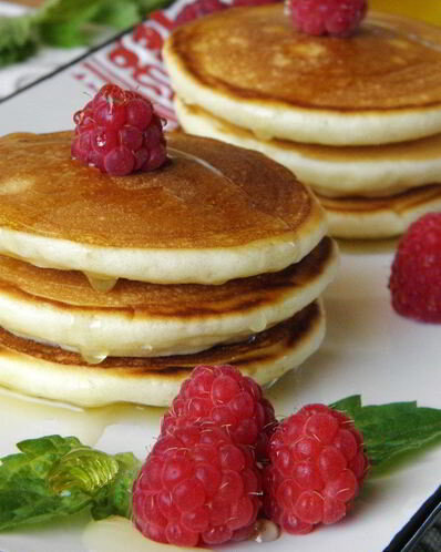 Подавать панкейки можно с мёдом, вареньем, ягодами, или посыпав сахарной пудрой.