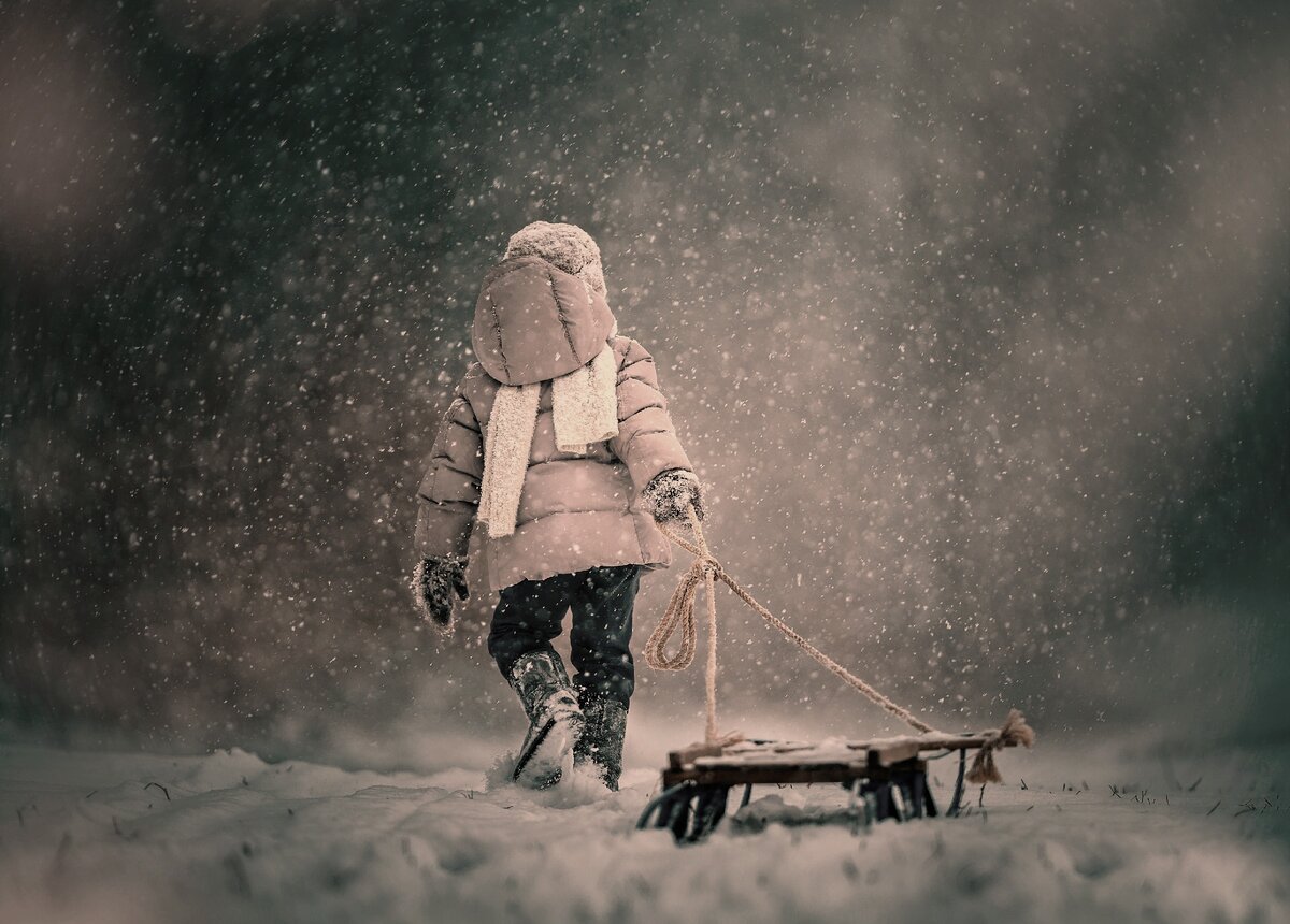 Он лихо скатился с горки на новых санках. Угодил прямиком в сугроб, но разве не в этом счастье для мальчишки?