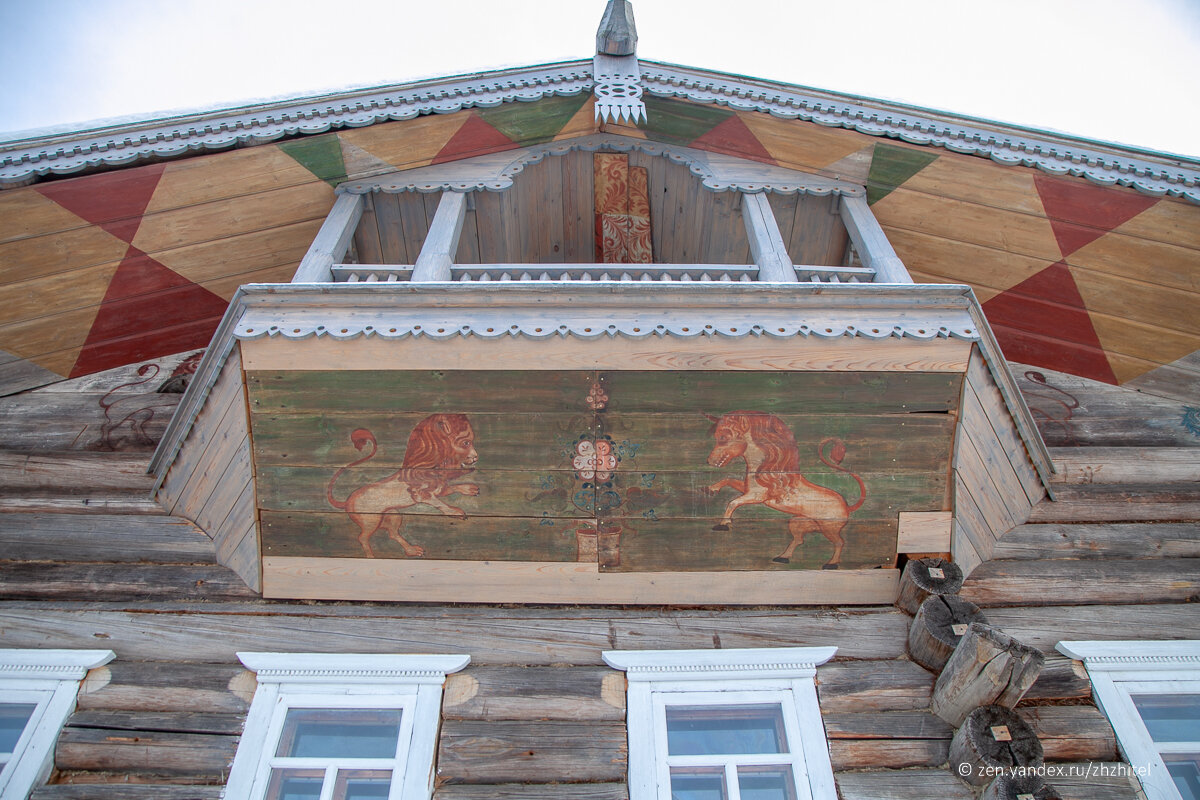 Начну с того, что дома на севере не принято ни красить, ни украшать росписями. Во-первых, климат тут суровый, краска будет быстро сходить, во-вторых, это дорого, в-третьих, дома прекрасно стоят сотни лет без всякого покрытия. Но в одном из районов по реке Вага состоятельные люди, чтобы отличиться начали расписывать фронтоны домов. Причем очень часто изображали льва и единорога.