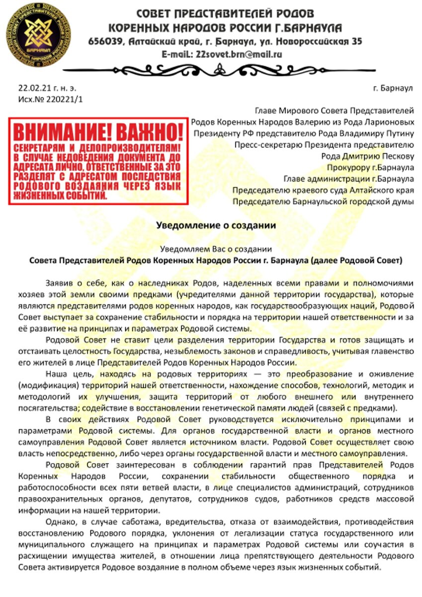 Уведомление о создании Совета Представителей Родов коренных народов России г.Барнаула 22.02.21 г.н.э.