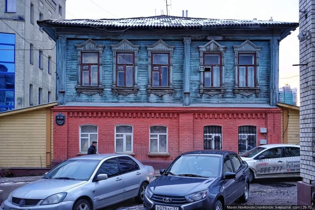 А вот тоже типичная ивановская архитектура. Первый этаж здания - кирпич, второй этаж - дерево с резными оконными рамами