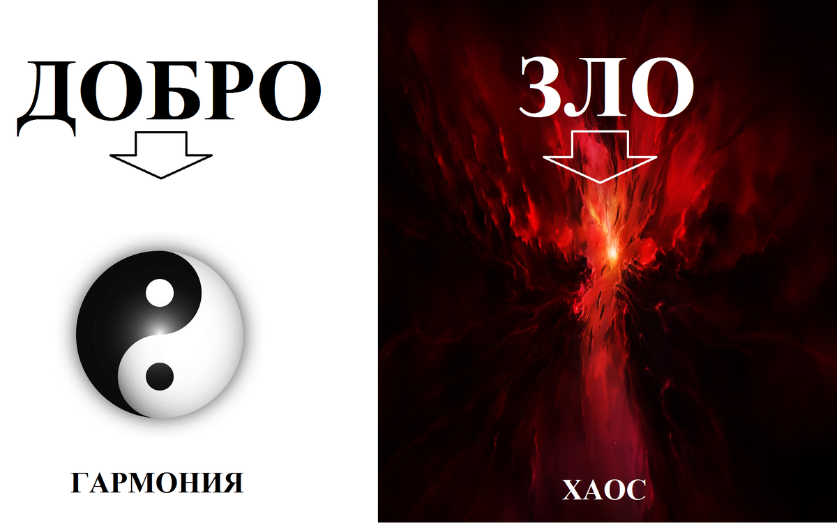 Проявление добра и зла начинается с рождения Вселенной. Многим известна теория Большого взрыва. Около 13,8 миллиардов лет назад Вселенная расширилась невероятно быстро, словно произошел большой взрыв. Он образовал галактики, звездные системы, планеты и стал точкой отсчета возникновения всего материального. Можно сказать, что материю породил хаос (взрыв), первое время во Вселенной ни о какой гармонии речи быть не могло, материя находилась в состоянии хаоса, пожирая саму себя во внутреннем противодействии. Если материя не начала бы путь от хаотичного внутреннего противодействия к гармоничному внутреннему взаимодействию, то, возможно, во Вселенной к настоящему времени не осталось бы материи. Здесь главное увидеть естественный процесс жизни Вселенной преобразование материи от хаоса к гармонии. И если нам не видно процесса преобразования материи, стремящейся к гармонии, то значит, мы смотрим на изменения в коротком времени, а нужно смотреть на преобразования в длинном времени. Ведь нельзя сказать, что от времени происхождения жизни на земле, живая природа не стремилась и не стремится к гармонии, впитывая в себя все больше и больше материи. Образование жизни так же является процессом добра, так как в живом организме материя гармонично взаимодействуем между собой, а в мертвом – хаотично.