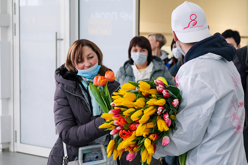 Международный аэропорт «Симферополь» присоединился к всероссийской акции «Вам, любимые». Пассажирок и сотрудниц «воздушной гавани» Крыма с приближающимся Международным женским днем поздравляют волонтеры и дарят женщинам цветы.