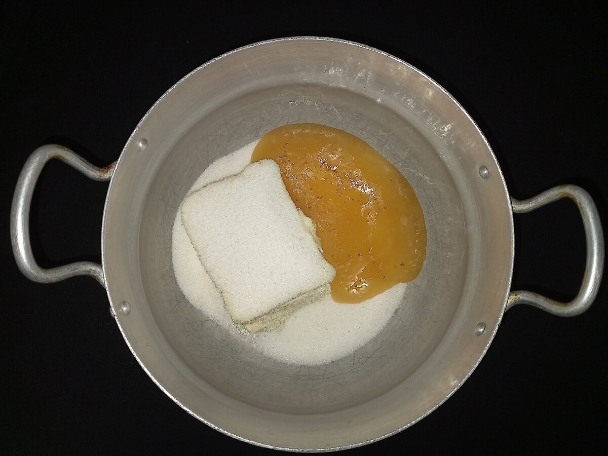 1. Берем кастрюлю, желательно с толстым дном. Кладем 300 гр. сливочного масла и 200 гр. сахара, 4 полных ст.л. меда.