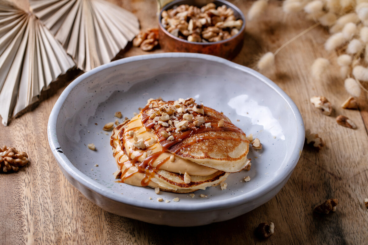 - Подавать на тарелке, чередуя блины и крем. Можно полить карамелью и посыпать дроблеными орехами.
