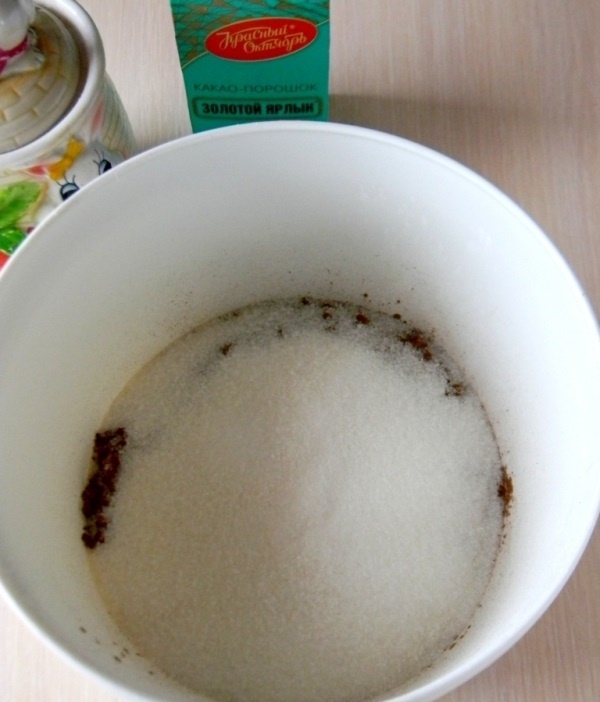 Сначала в глубокую миску добавить просеянную муку, сахар, какао, соду, соль, разрыхлитель.