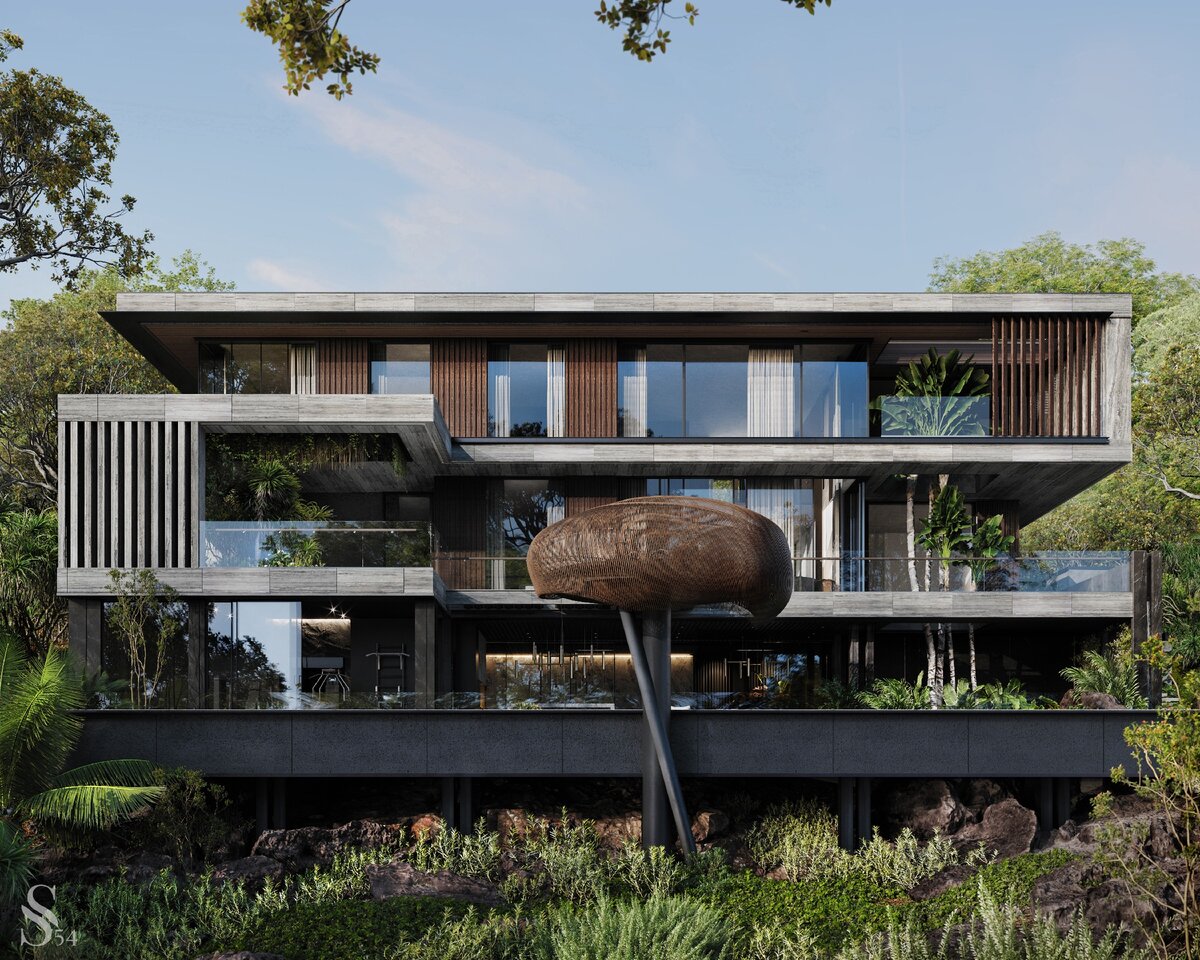 В основе концепции раскрывающейся архитектуры лежит гармония внешних форм и интерьера, их пространственная взаимосвязь с ландшафтом и адаптация под уникальный образ жизни владельца. Архитектура дома в буквальном смысле раскрывается с каждой стороны света. Стихии воды и земли, выраженные в ошеломительном ландшафтном дизайне и декоративных водопадах, вписаны в эту архитектуру, оживляя её и сохраняя реальности естества природы. Перголы с системой раздвижного остекления, предусмотренные для сезона дождей, лаконичные и сверхпрочные натуральные материалы, адаптированная планировка – отражение духа современности.