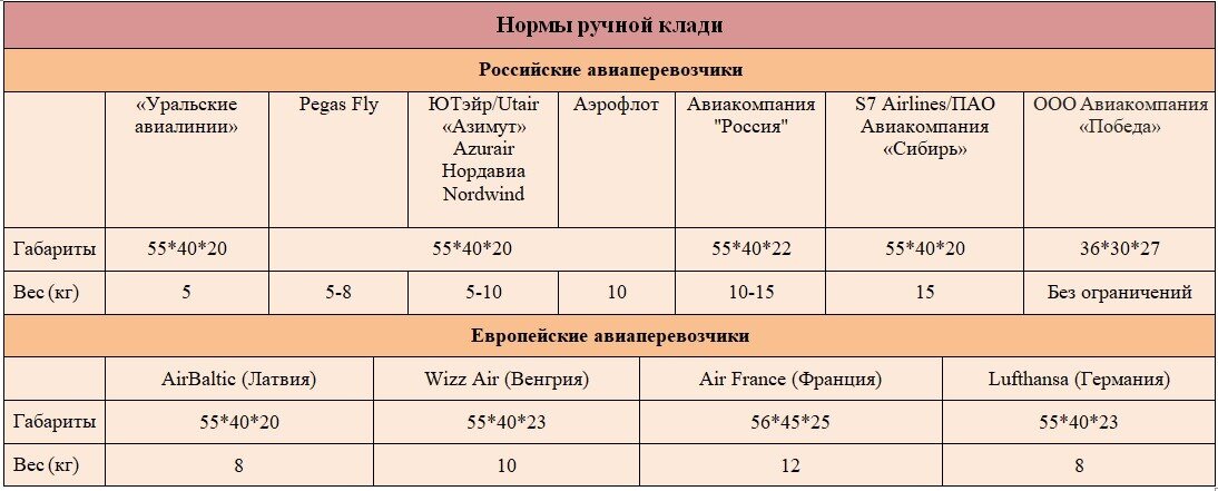 Требования по размерам к ручной клади вы можете посмотреть в таблице ниже: