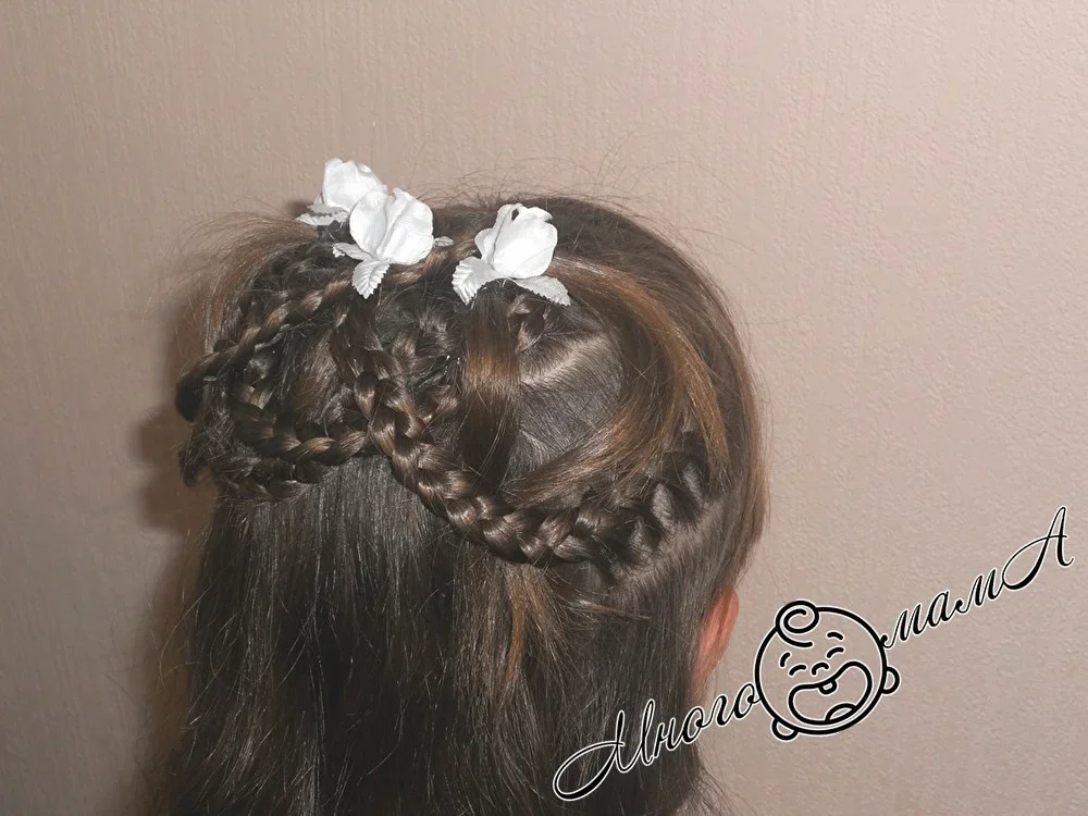Закрепляем невидимками, чтобы прическа надежно держалась. Сверху украшаем декоративными шпильками или заколками с цветочками. Прячем кончики косичек внутрь.