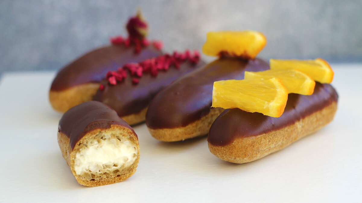 Украшаем эклеры на свой вкус. Покажу вам несколько вариантов. Небольшие дольки апельсина, их я покрыла гелем на агар-агаре, чтобы они не заветривались. Уже показывала этот способ покрытия фруктов в двух тортах, ссылку оставлю в описании. Эклеры можно покрыть как полностью, так и сделать ассиметричный декор, выложить его только с одной стороны. Также я выкладываю сублимированную малину. И сушёный бутон розы. Один просто покрою сублимированной малиной. Кстати, есть способ декора и вовсе без глазури, эклеры прекрасно смотрятся, если на них просто выложить с помощью насадки белый стабильный крем. И также добавить, ягоды, фрукты, любой декор. Один эклер посыпаю миндальными лепестками.