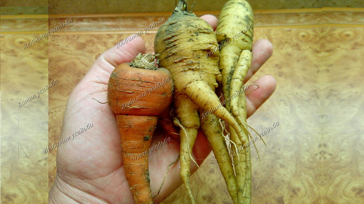 Здравствуйте. С вами Светлана и канал ЛЮБИМАЯ УСАДЬБА Здравствуйте друзья. Давайте разберемся почему, при должном , казалось бы уходе, морковь вырастает уродливой. Мы и семена покупаем элитные, и грядки удобряем и сеем вовремя, но все же корнеплоды в итоге не оправдывают наши ожидания А все очень просто. Во первых - морковь не терпит свежего навоза, лишь через 2 года после его внесения на таких грядках можно высевать семена моркови Во вторых - такое будет происходить, если верхний слой почвы сильно уплотнен, поэтому так важна перекопка грунта перед посевом, а не рыхление, как делают многие огородники В третьих - когда формируются корнеплоды, ( внимание : не созревают, а лишь формируются. Т.е. первая половина вегетации моркови) они нуждаются во влажной почве и ни в коем случае нельзя допускать дефицита влаги в этот период. Дело в том, что в неблагоприятных почвенных условиях главный корень отмирает или изгибается, а рост боковых корней, напротив, усиливается. В этом случае корнепло