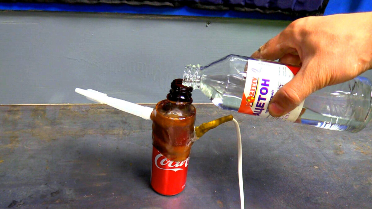 Ну а потом наливаем в наш чайник ацетон подключаем свечу и буквально через минуту ацетон закипает и его пары подъедают матовую поверхность стекол делая ее идеально гладкой.