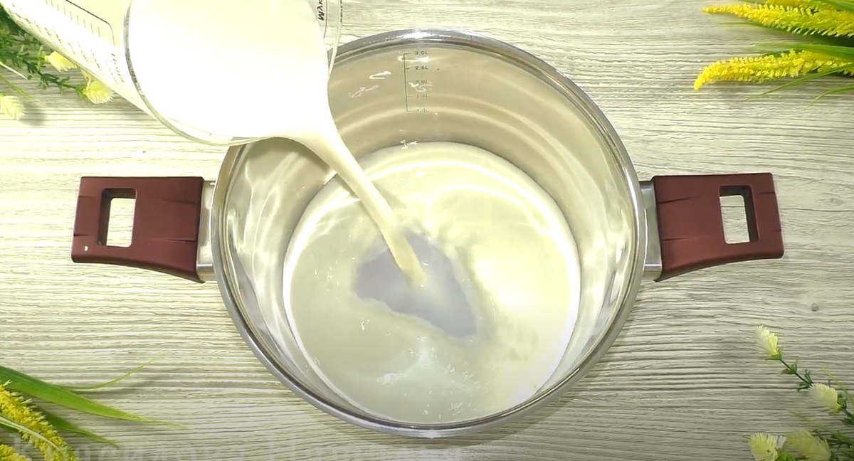 Начинаем приготовление с крема. Напоминаю готовится всё очень просто и быстро, в кастрюлю или сотейник вливаем молоко и ставим нагревать на плиту.