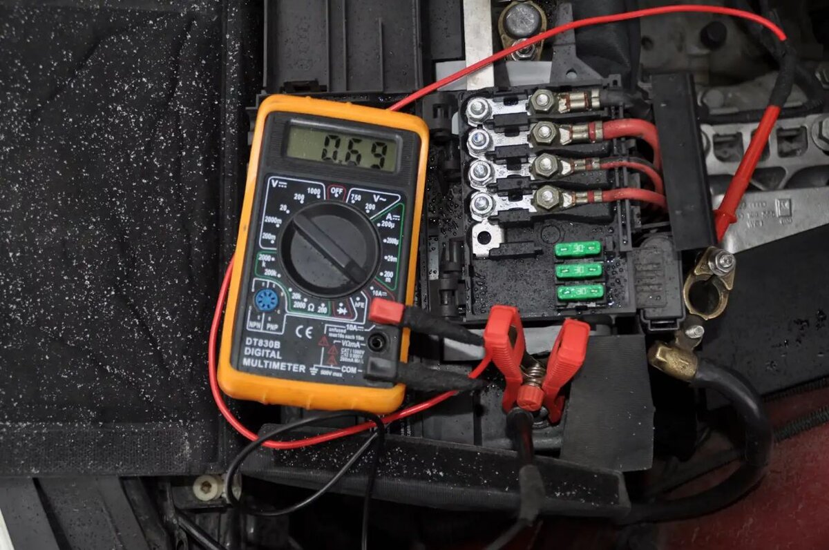 Я проверяю утечку тока обычным мультиметром путем измерения до 10А. Для этого подойдёт самый дешёвый мультиметр. По приезду я внимательно осмотрел автомобиль на предмет дополнительного оборудования. Ведь практически в 90 процентах случаев разрядку аккумулятора вызывает дополнительное оборудование.