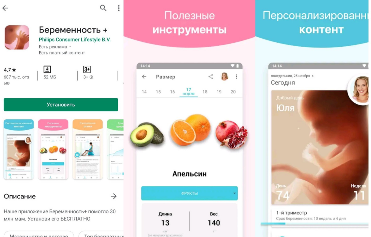 Забавно, но приложение сравнивает набор веса и рост малыша с фруктами и овощами. В нем имеется большое количество видео уроков, гимнастики и прочие упражнения. Трекер оснащен отдельным блоком для пап, где можно подучить информацию об эмоциональном состоянии беременной, интимной жизни.