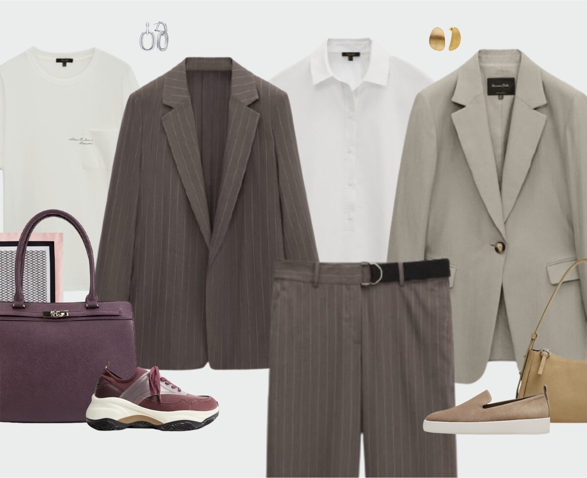 Ниже приведу ещё один вариант комбинирования делового стиля и спортивного. Берем структурированный блейзер из костюмной ткани и сочетаем его с более "расслабленной" одеждой: футболкой, джоггерами и замшевыми лоферами. За счет "цветового ключа" всё сочетается друг с другом. Цветовая гамма приглушенная, в образе минимум деталей.