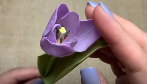 Дальше вставляем проволоку в стебель и приклеиваем бутон со стеблем. Потом лист приклеим и подкрасим пастелью , растушуем пальцем.