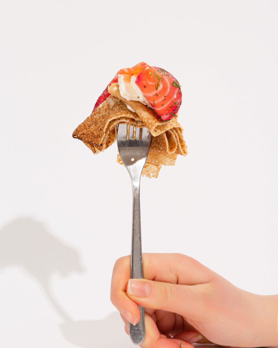 Сложить на тарелке как нравится и подавать на стол. Блины можно разогреть на сухой нагретой сковороде 1 минуту.