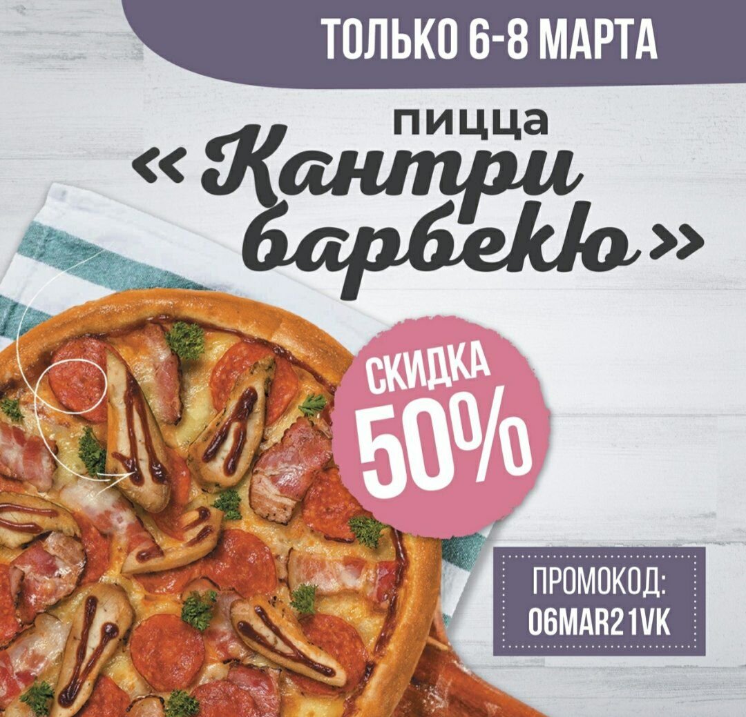 Заказываем пиццу Кантри барбекю 30см и вводим промокод: 06MAR21INST, 06MAR21VK