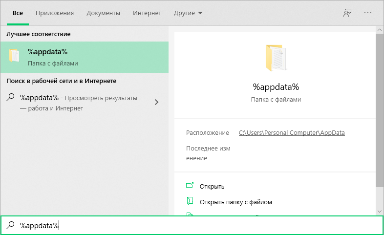 1. Используем комбинацию клавиш Win+S. Далее вводим %appdata%, нажимаем Enter:
