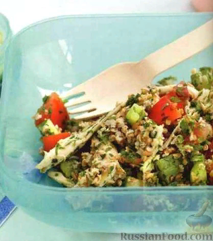 Продукты (на 4 порции) Крупа булгур - 0,5 стакана Филе куриное вареное (резаное кусочками) - 0,75 стакана Помидоры сливки (чищеные и рубленые) - 1,5 стакана Перец болгарский красный (рубленый) - 0,5 стакана Огурец (резаный мелкими кубиками) - 0,5 стакана Вода кипяток - 0,5 стакана Петрушка свежая