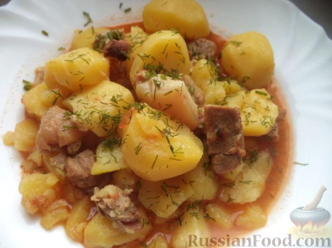 Продукты (на 6 порций) Свинина - 500 г Картофель - 1 кг Лук репчатый - 1-2 шт. Помидоры свежие - 2-3 шт или томат-паста - 1 ст. ложка Чеснок (по желанию) - 2 зубчика или аджика (по желанию) - 1 ч. ложка Растительное масло - 3 ст. ложки Лавровый лист - 1 шт. Соль - по вкусу
