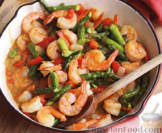 Продукты (на 4 порции) Креветки среднего размера (свежие или замороженные) - 450 г Спаржа (резаная кусочками 5 см) - 300 г Перец болгарский красный (очищенный от семян и резаный кубиками 1 см) - 1 шт. Лук репчатый (мелкорезаный) - 1/2 стакана Чеснок