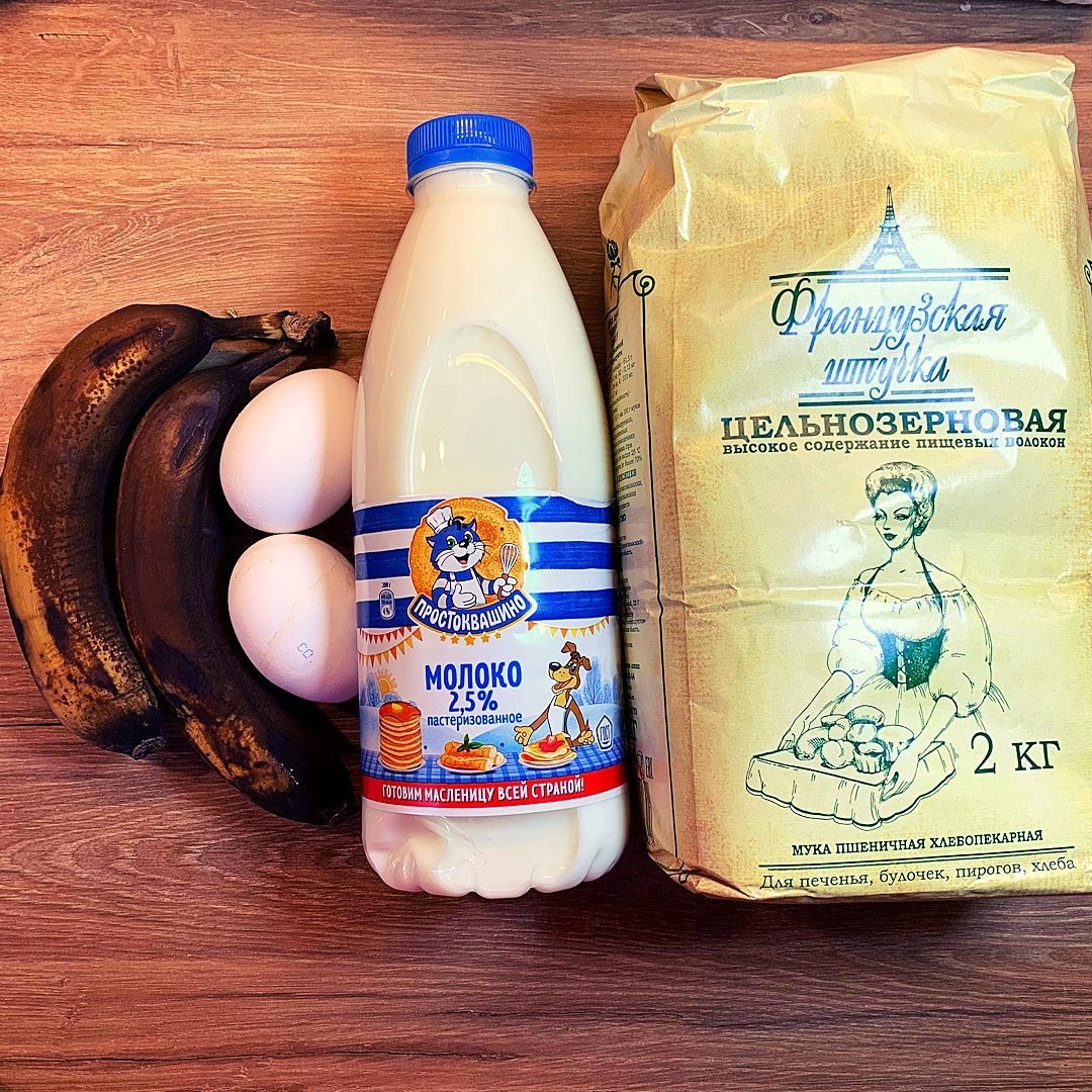 К получившейся массе просеиваем муку, затем добавляем молоко и все тщательно перемешиваем. На этом этапе смотрите на консистенцию, возможно нужно будет добавить муки или молока, чтобы получилась тесто для тонких блинчиков, все зависит от бананов.