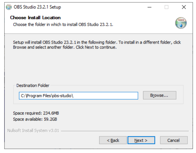 3. Во время установки укажите путь к месту, где находится программа OBS Studio . Обычно изменение пути установки не требуется.