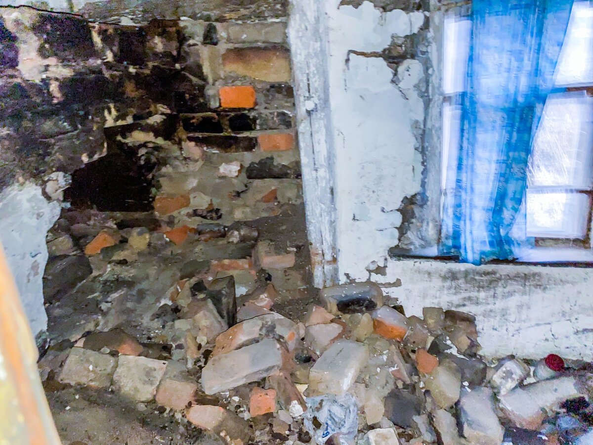 Комната эта когда-то отапливалась от печки. К сожалению, печка эта частично уже разломана. Но кое что от нее всё-таки осталось.