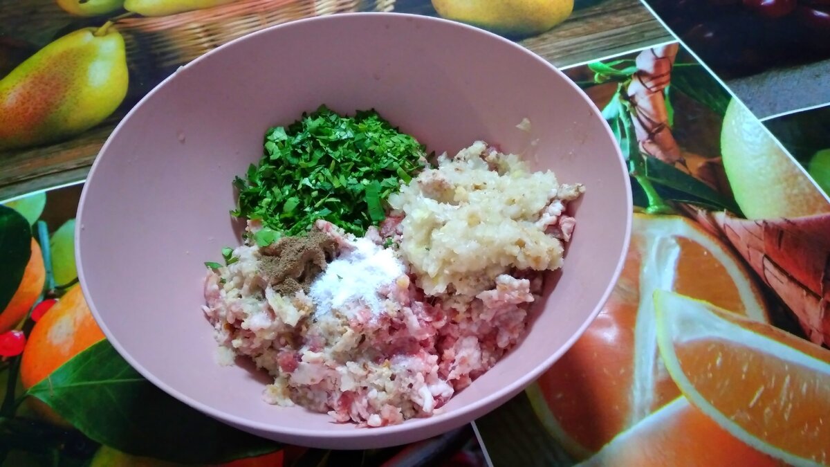 Берем фарш, можно любой у меня свиной. Добавляем к нему лук пропущенный через мясорубку, соль, перец, свежую петрушку, хорошо вымешаем руками.