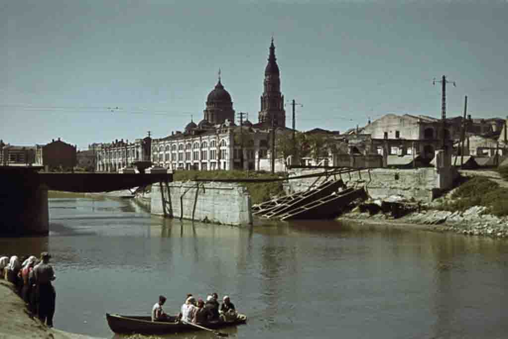 Color photo of the Second World War: The destroyed bridge across the Lopan River in the Nazi-occupied Kharkov. Residents of the city have to cross from one bank to another on a boat.