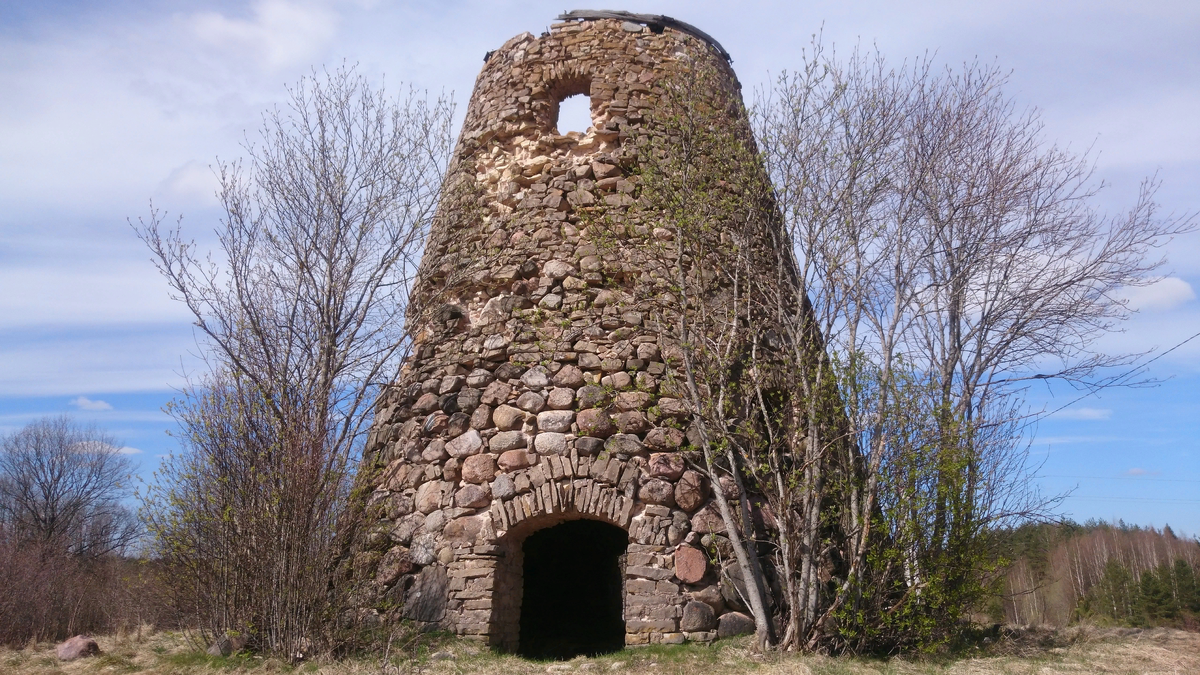 Следующие две фотографии – руины мельницы в деревне Первое Мая (за Кингисеппом, не доезжая Нарвы, координаты 59°23'39"N 28°23'8"E). На «Топографической карте частей Санкт-Петербургской и Выборгской губерний» 1860 г. она указана как часть мызы Анненгофф, принадлежавшей барону И.О.Корфу, по приказу которого, по некоторым сведениям, и построена мельница.